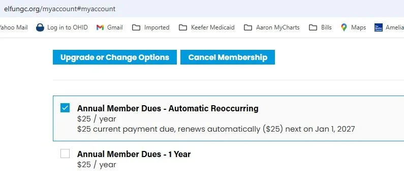 Pay by credit card on this site under Membership>>Pay Dues www.elfungc.org